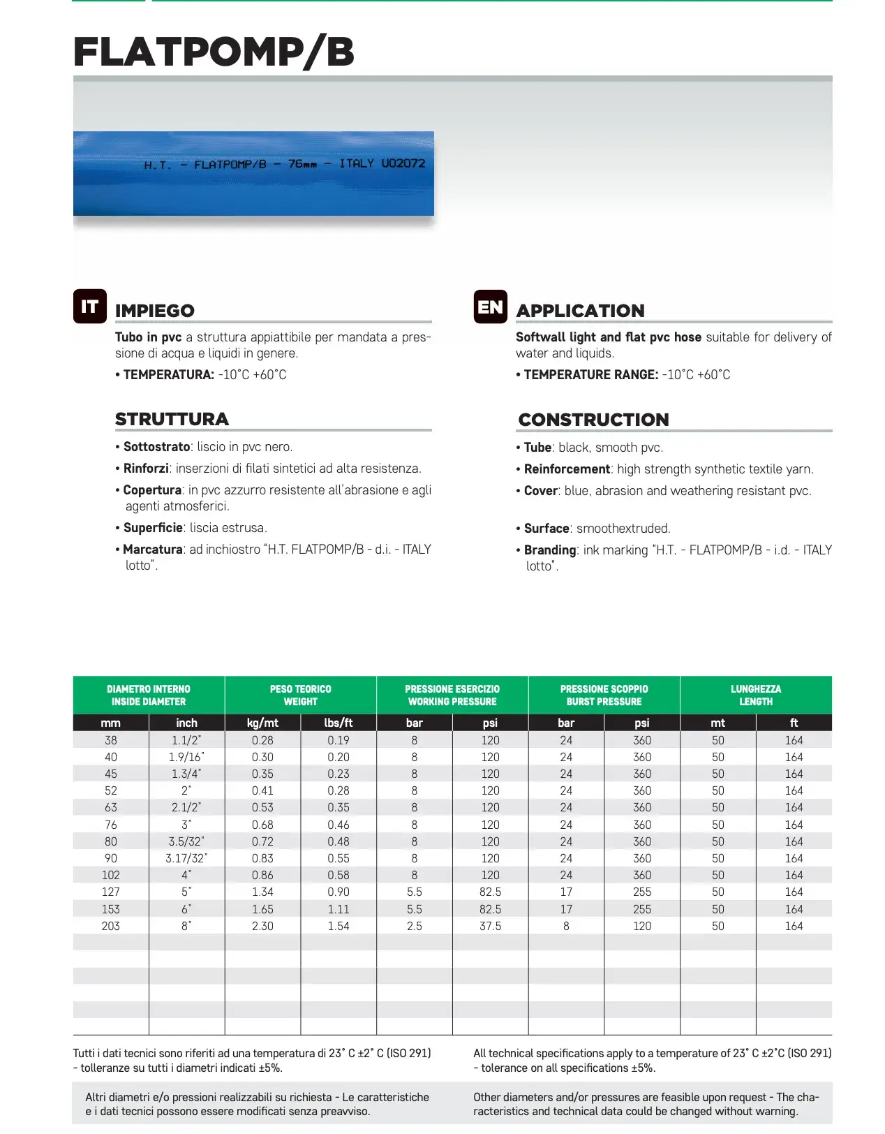 Tubo FLATPOMP/B in pvc appiattibile e utilizzabile per mandata di acqua e liquidi in genere.
